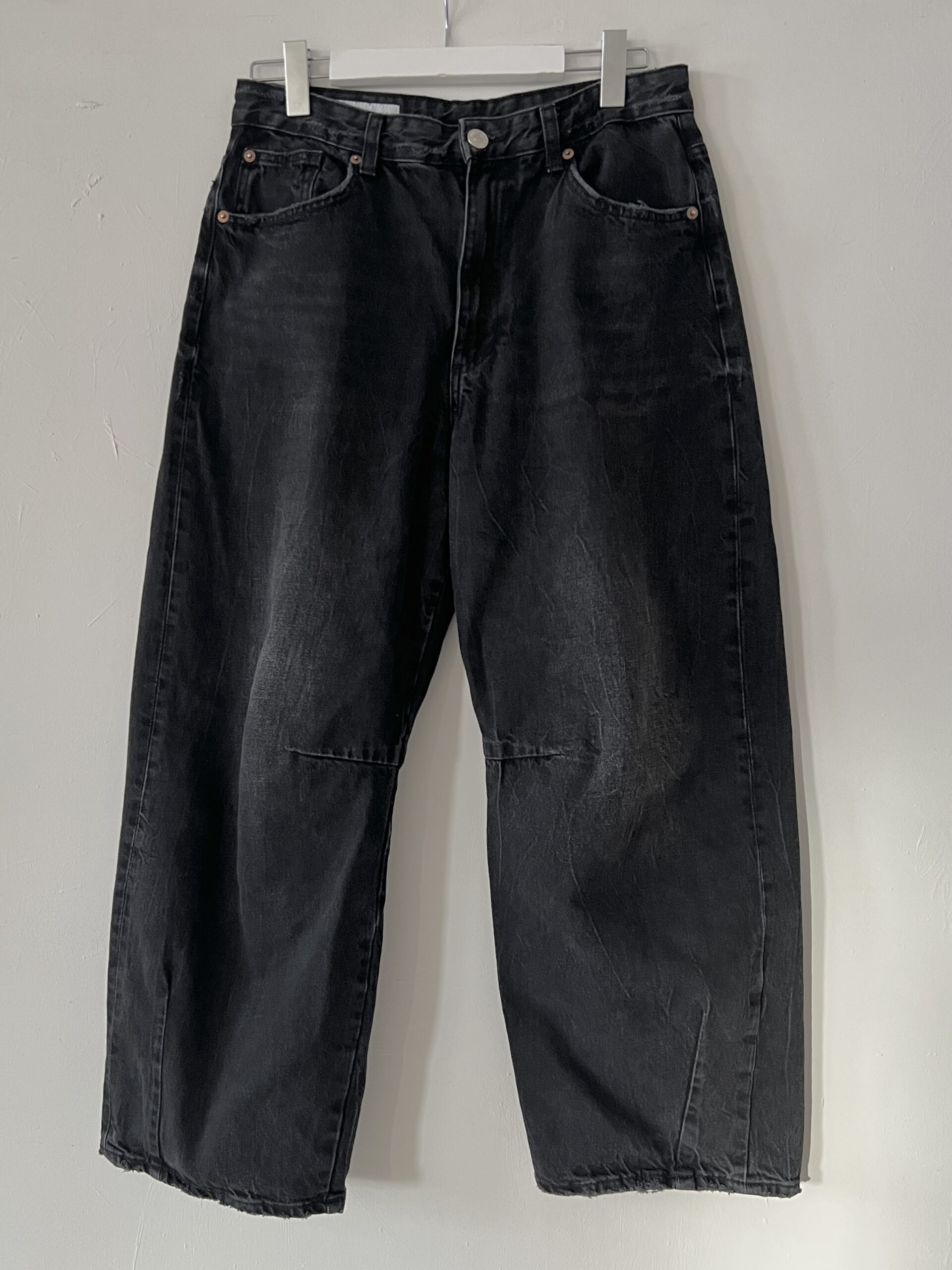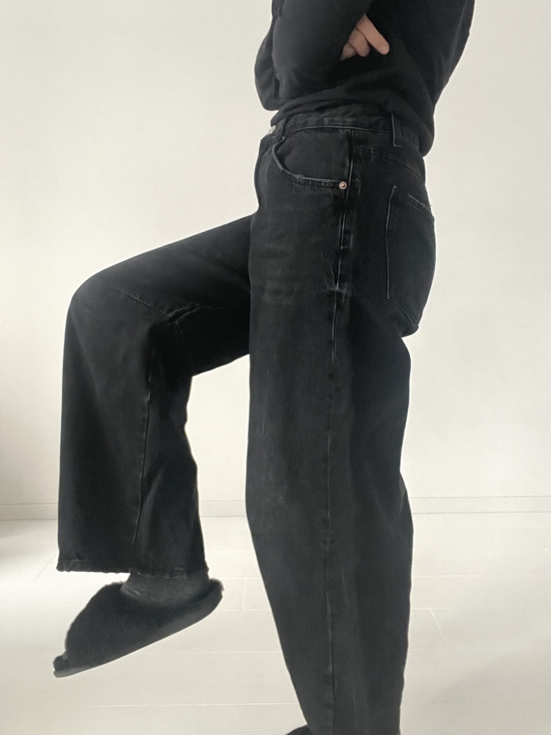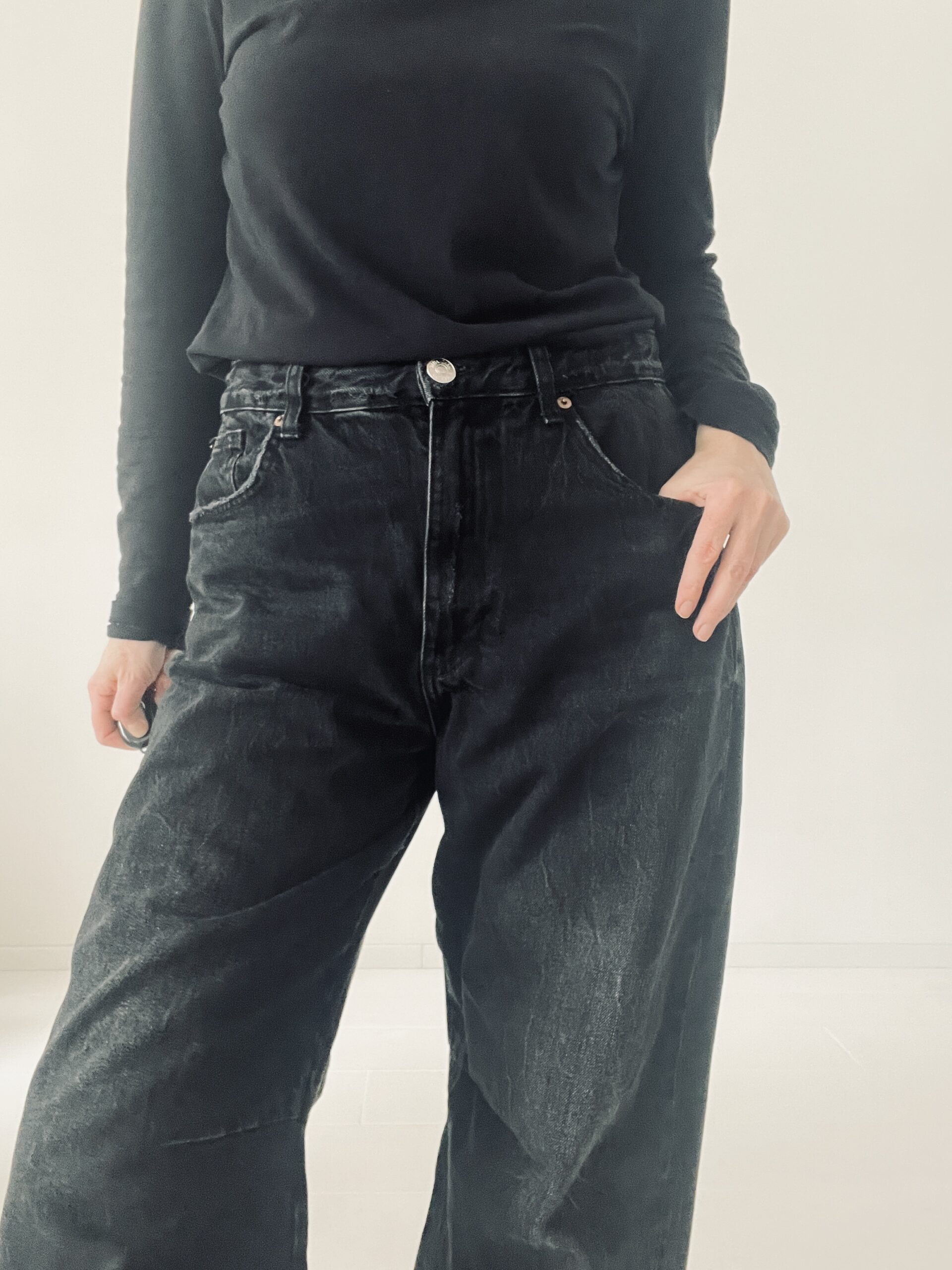 Czarne jeansy ZARA, szerokie, nogawki typu baggy barrel – zaszewki modelujące szerokość nogawek .