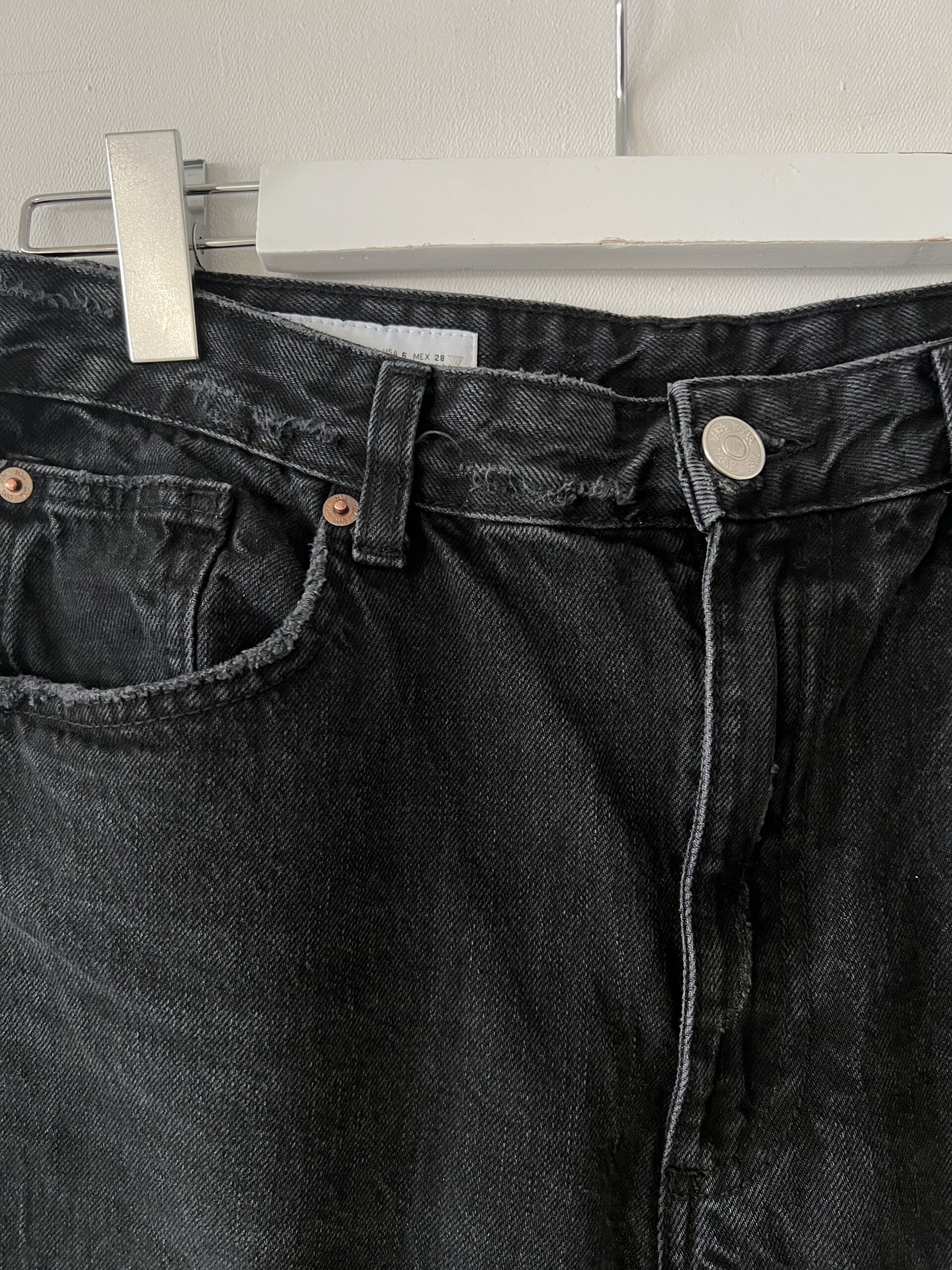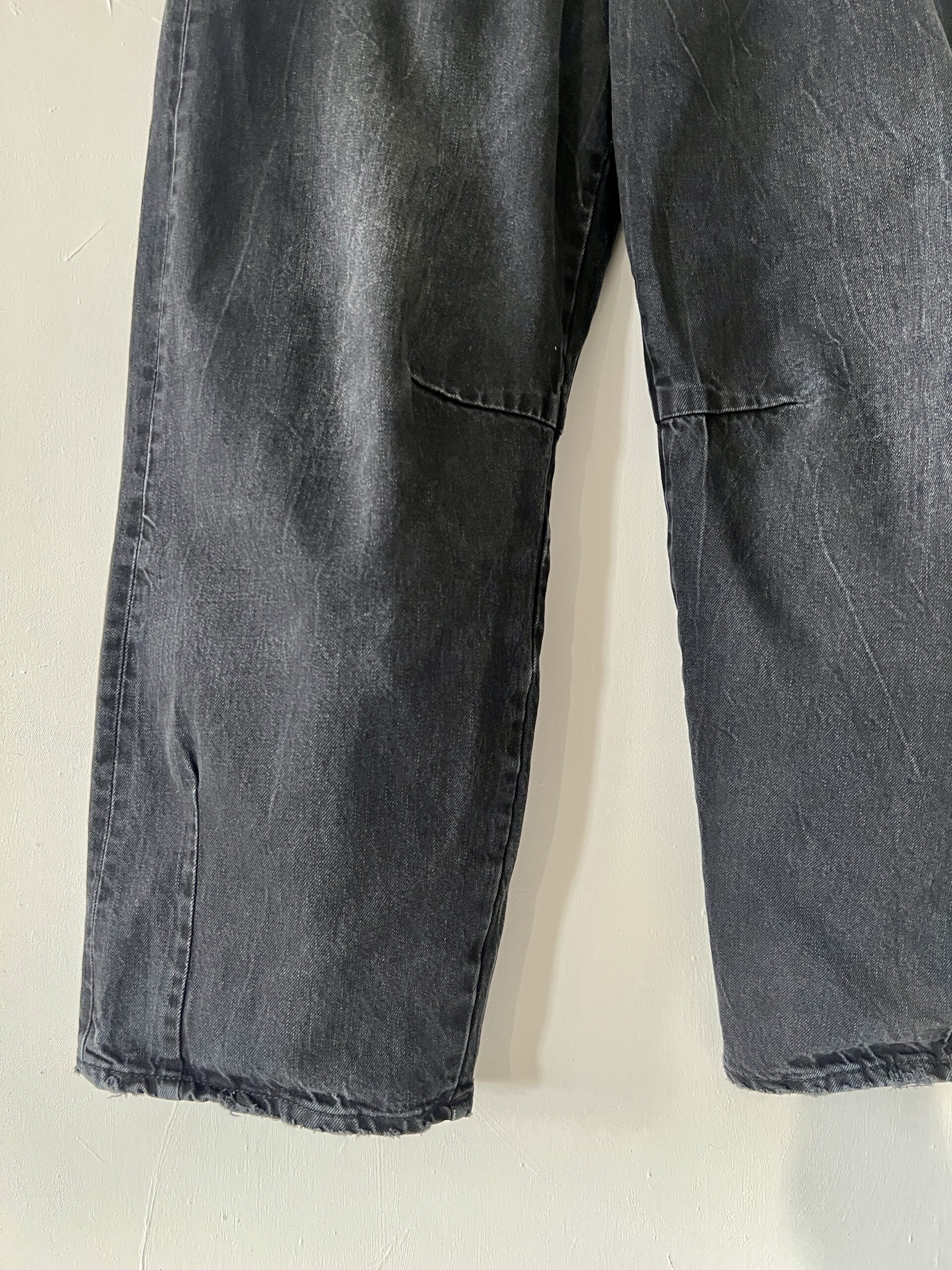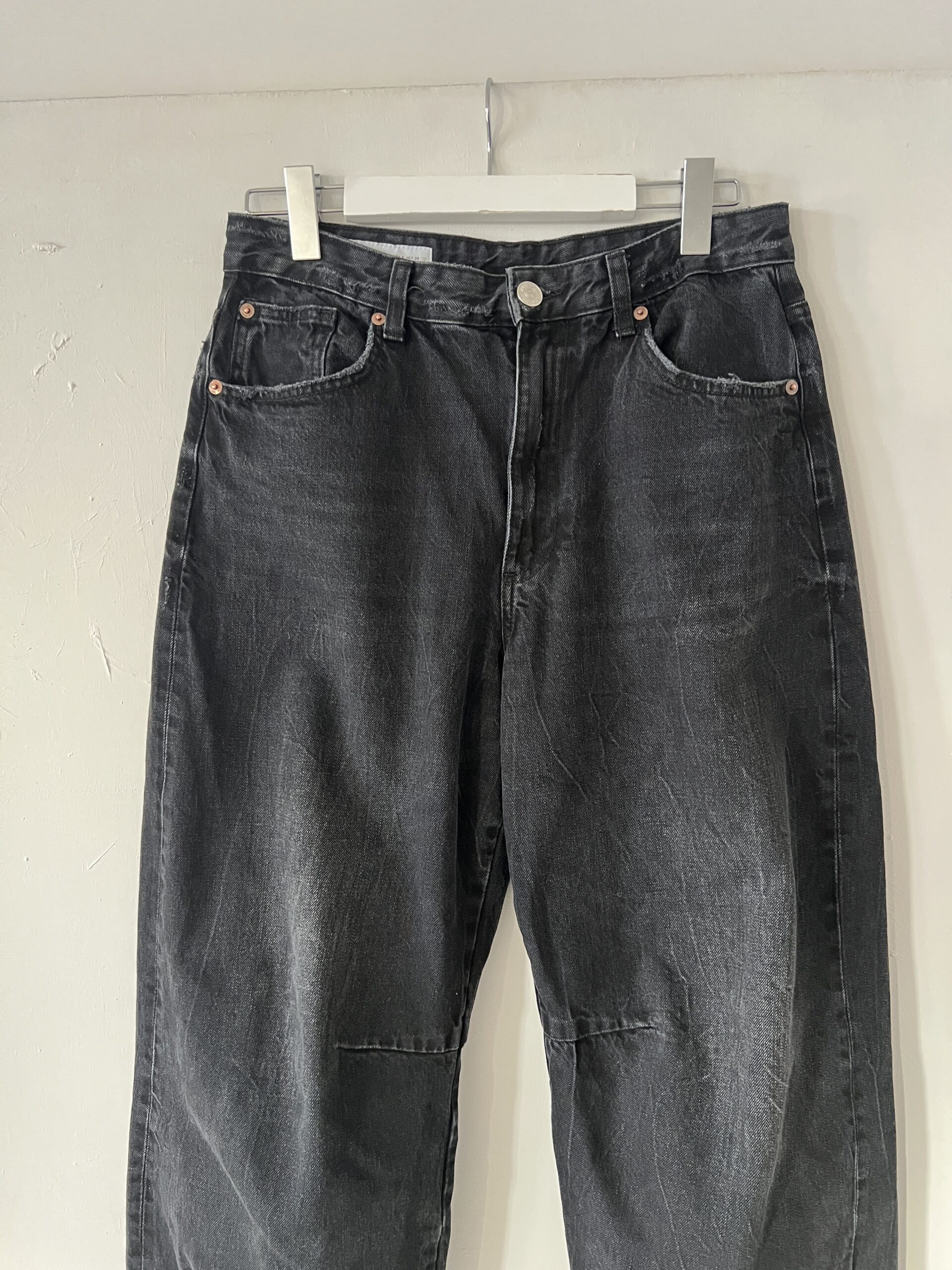 Czarne jeansy ZARA, szerokie, nogawki typu baggy barrel – zaszewki modelujące szerokość nogawek .