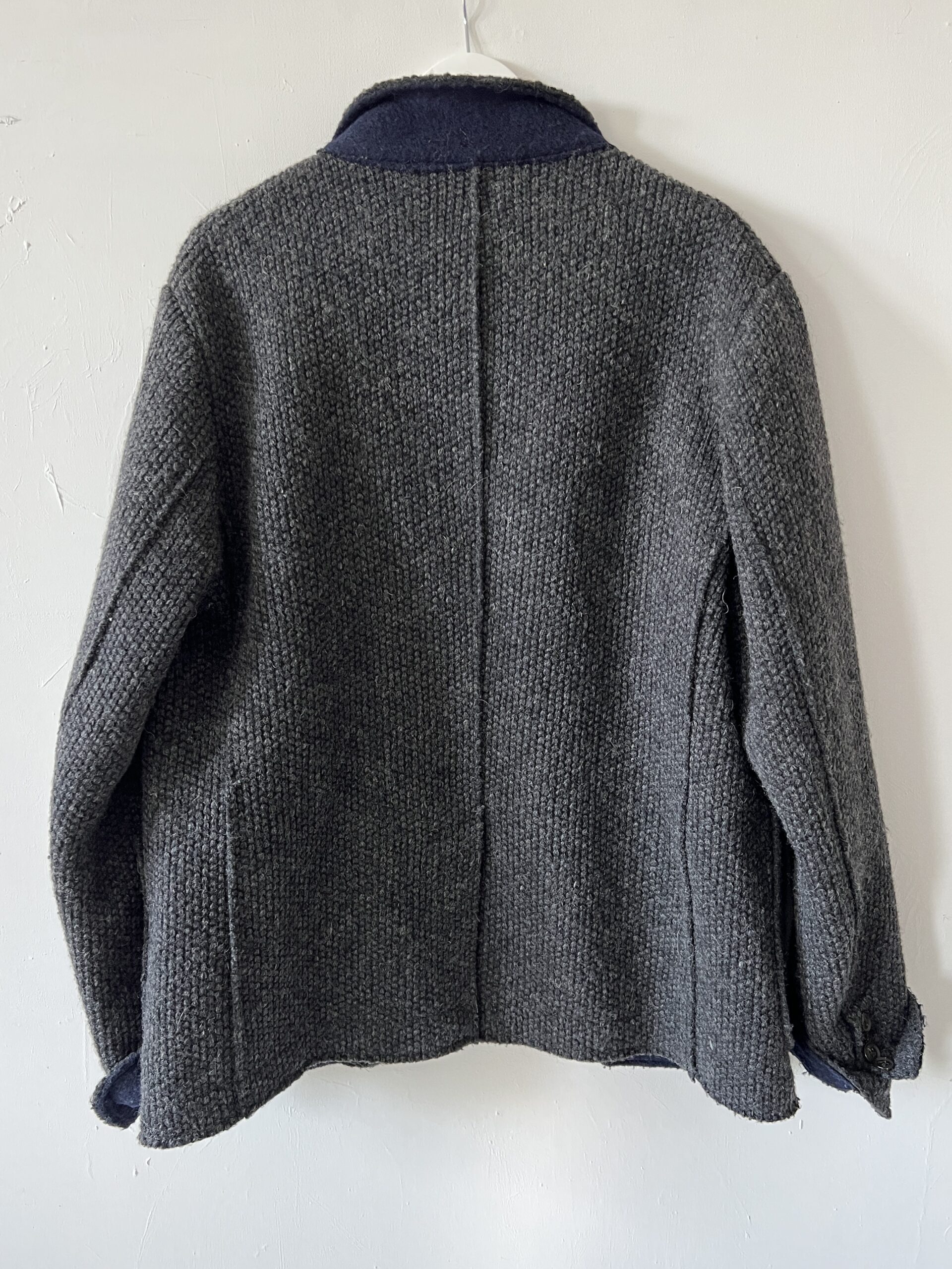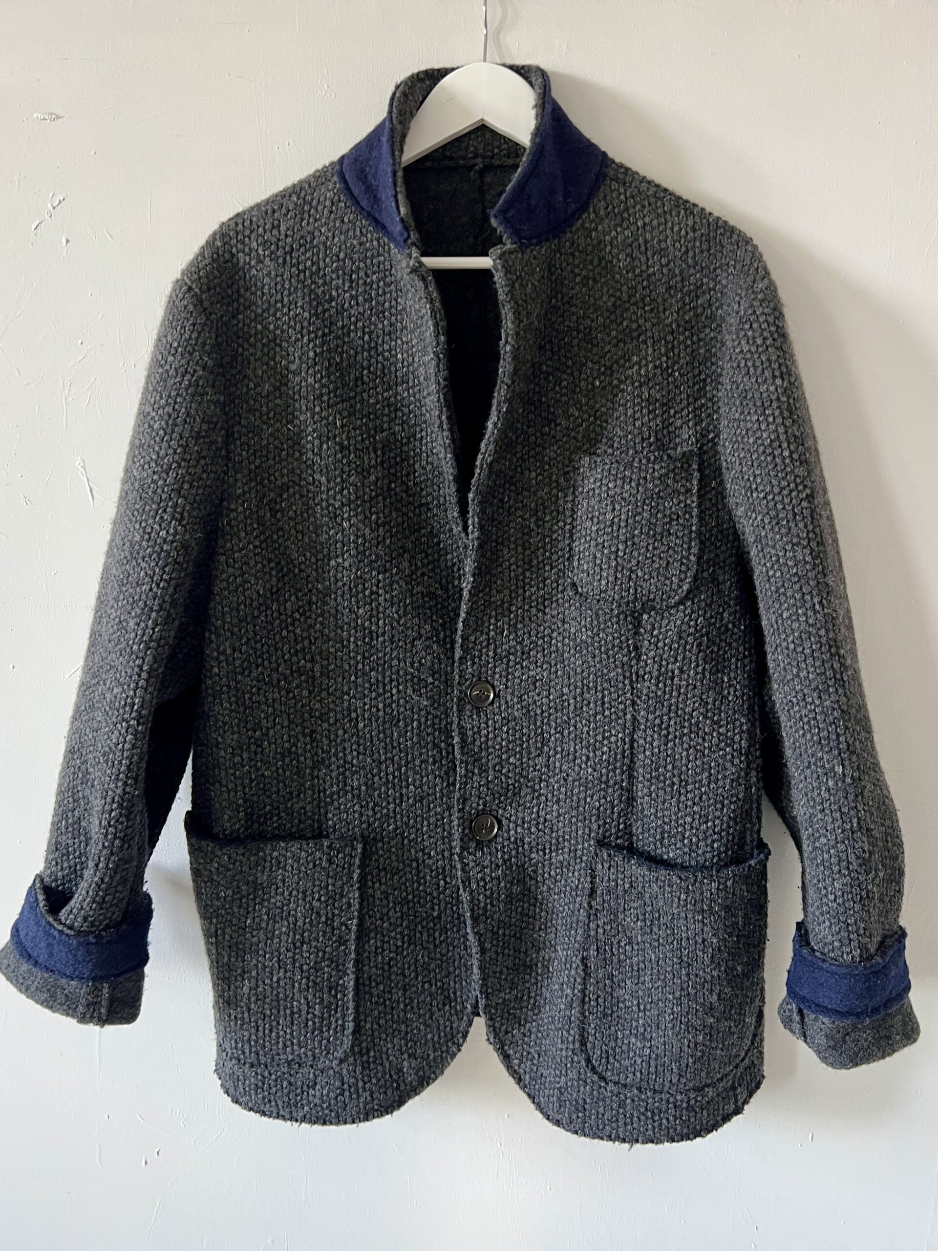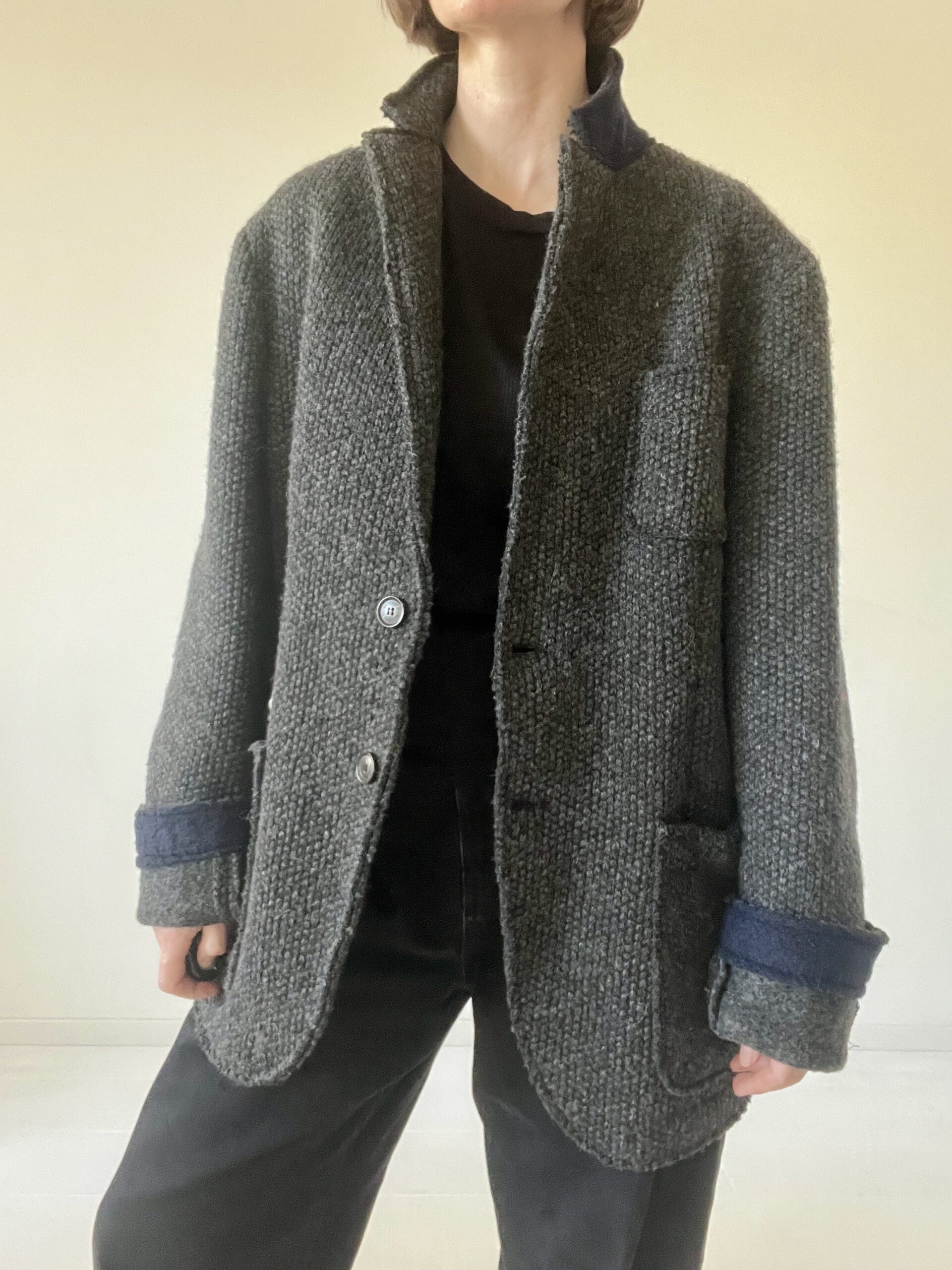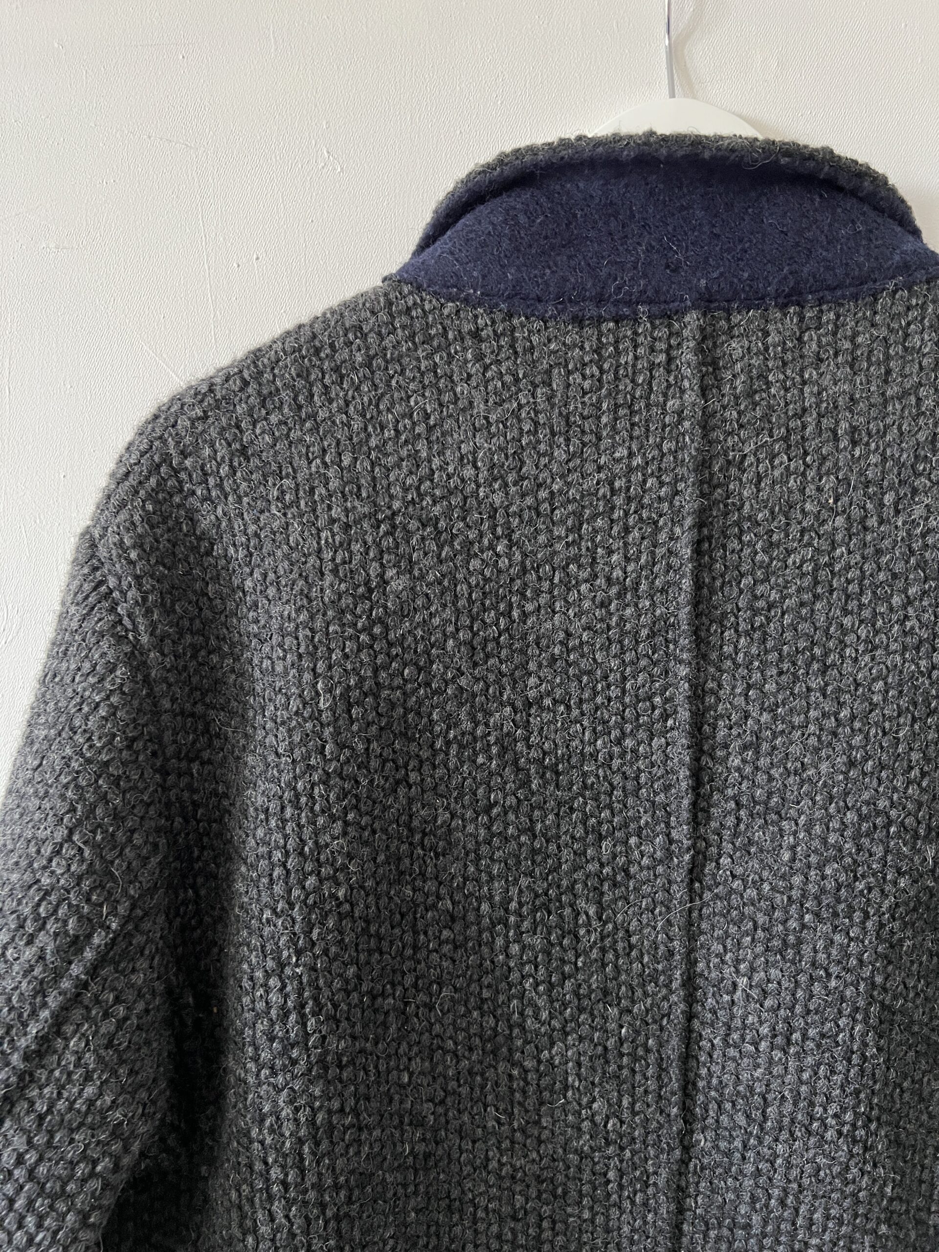 Męska wełniana marynarka, dobra do noszenia jako oversizeowy kubrak „z szafy chłopaka”, mankiety i kołnież wykończone kontrastową dzianiną