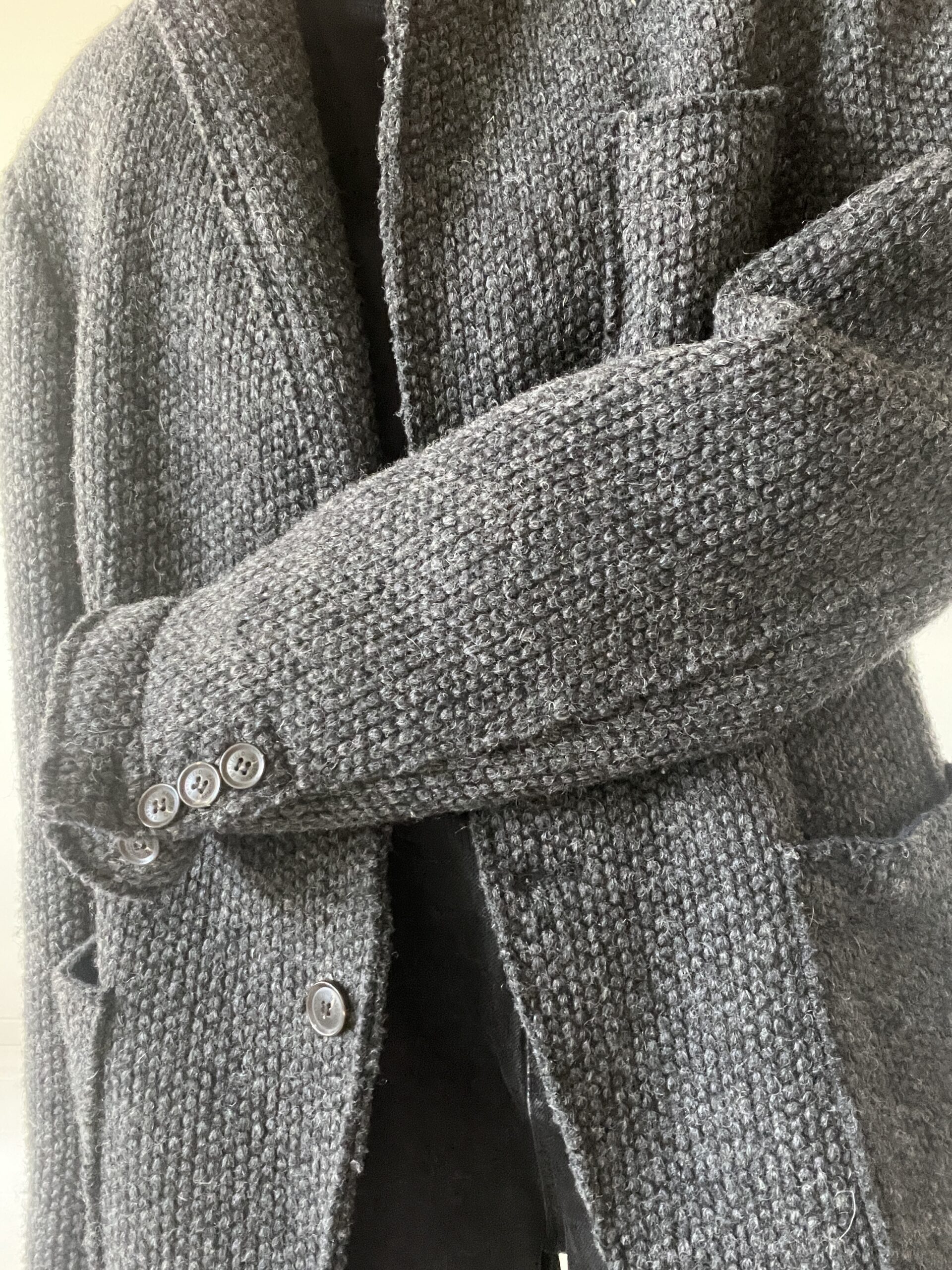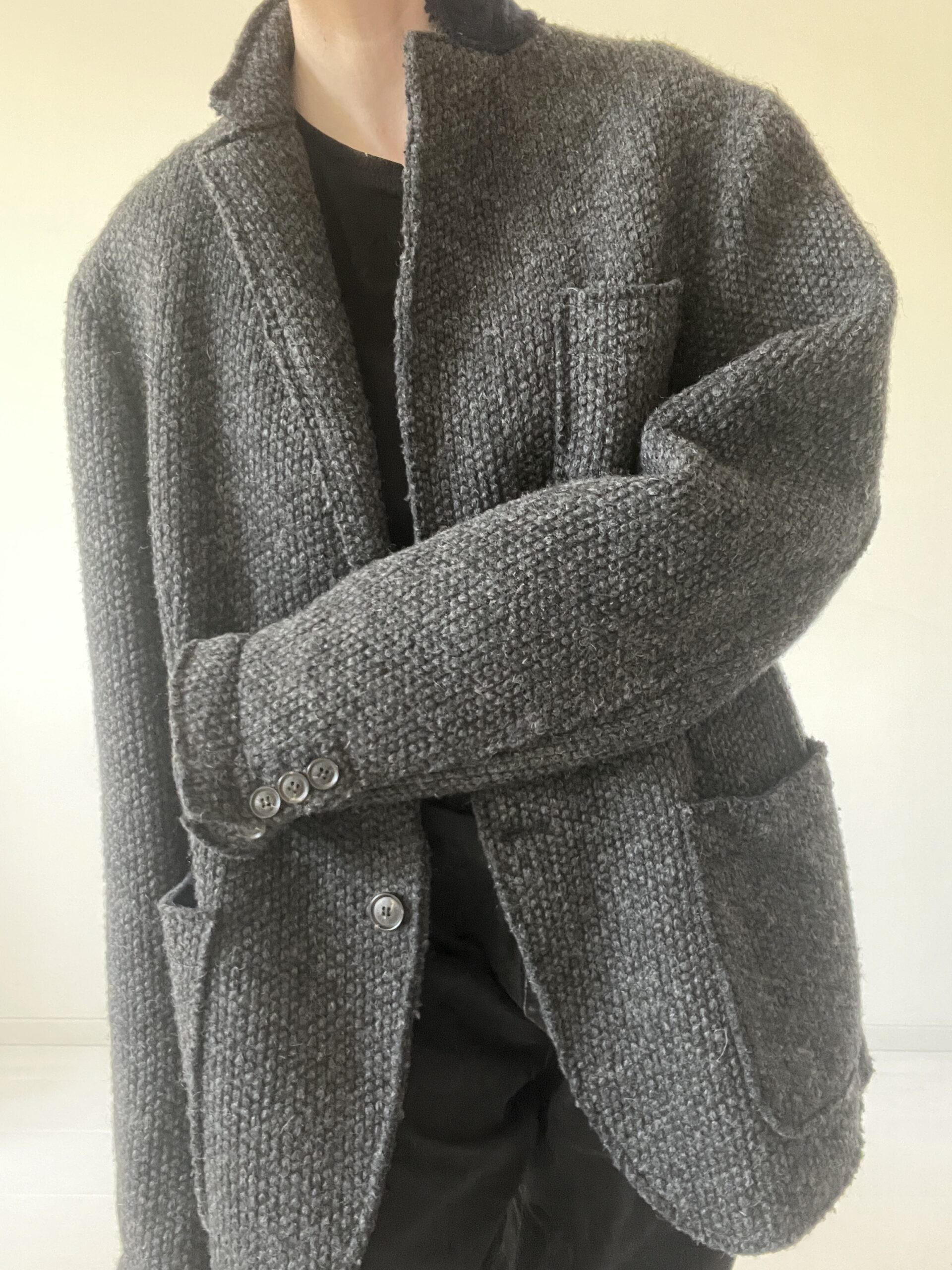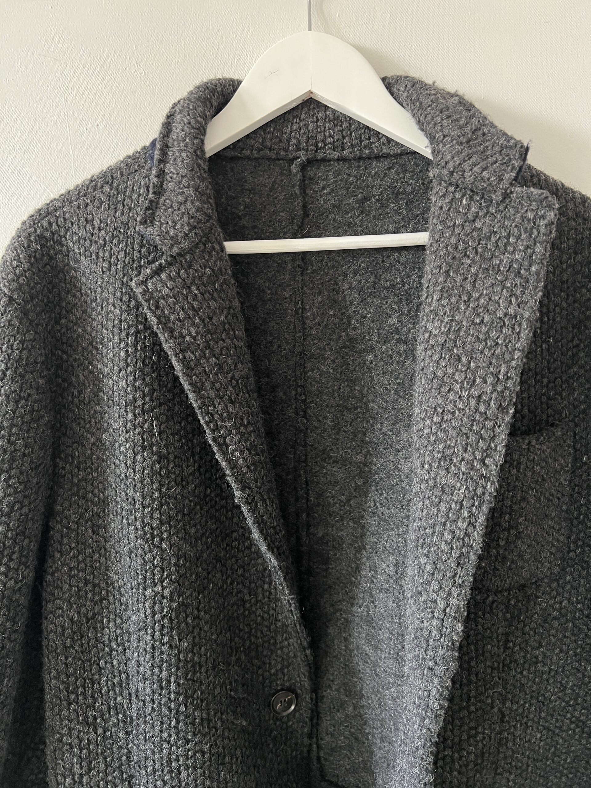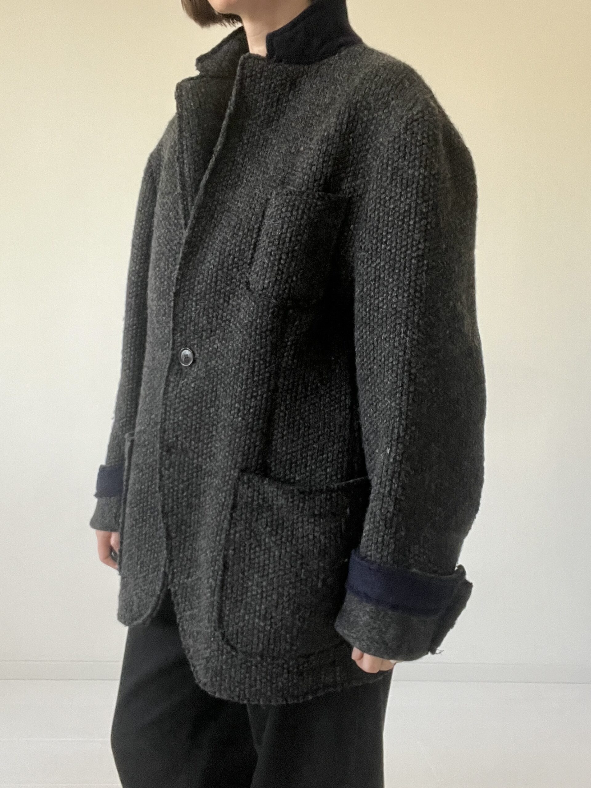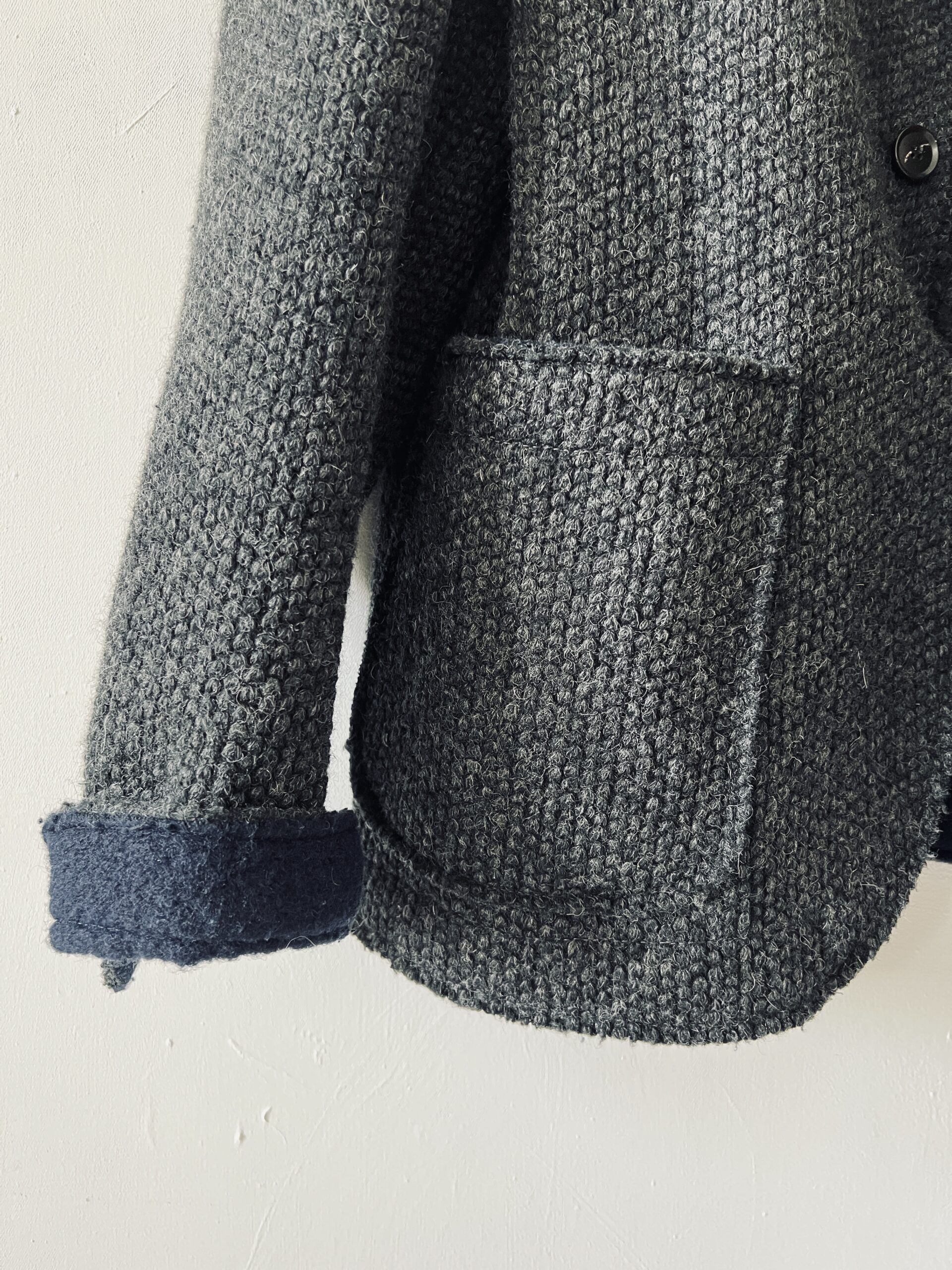 Męska wełniana marynarka, dobra do noszenia jako oversizeowy kubrak „z szafy chłopaka”, mankiety i kołnież wykończone kontrastową dzianiną