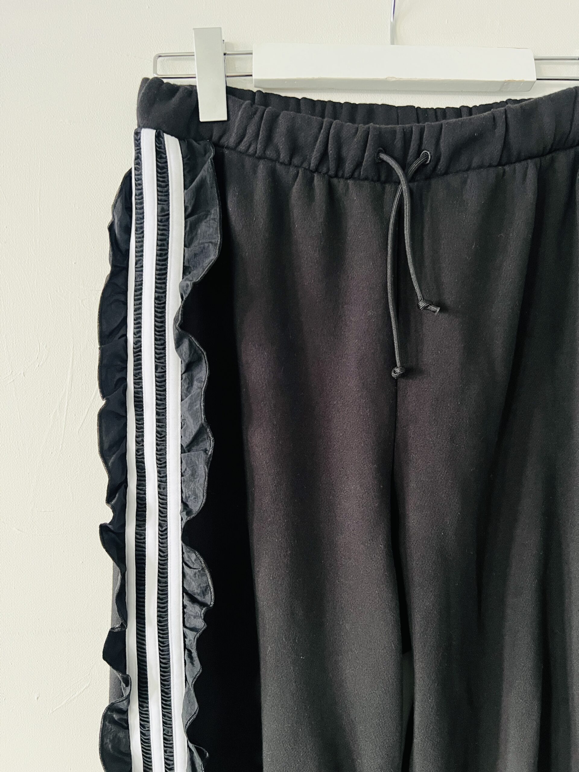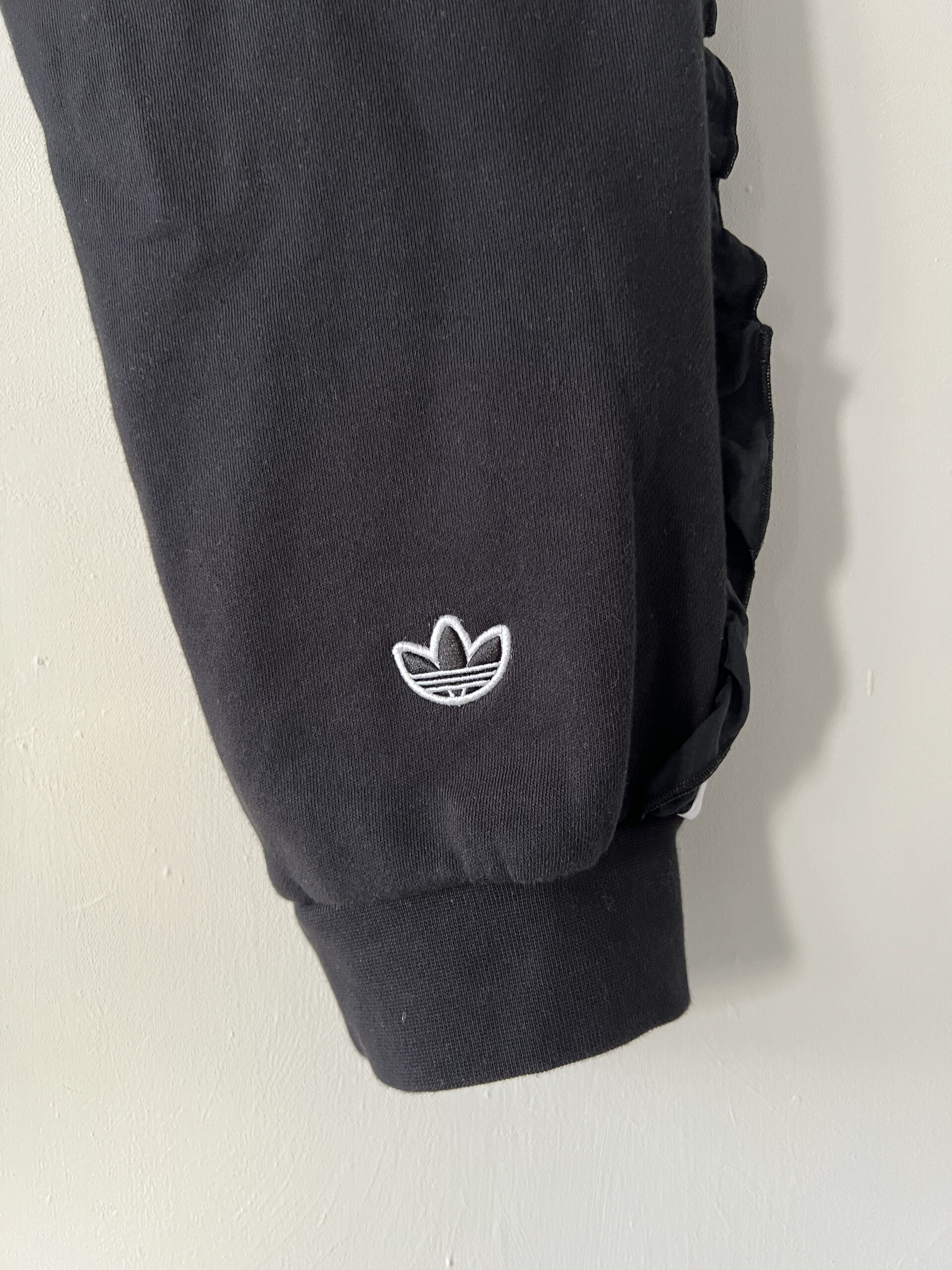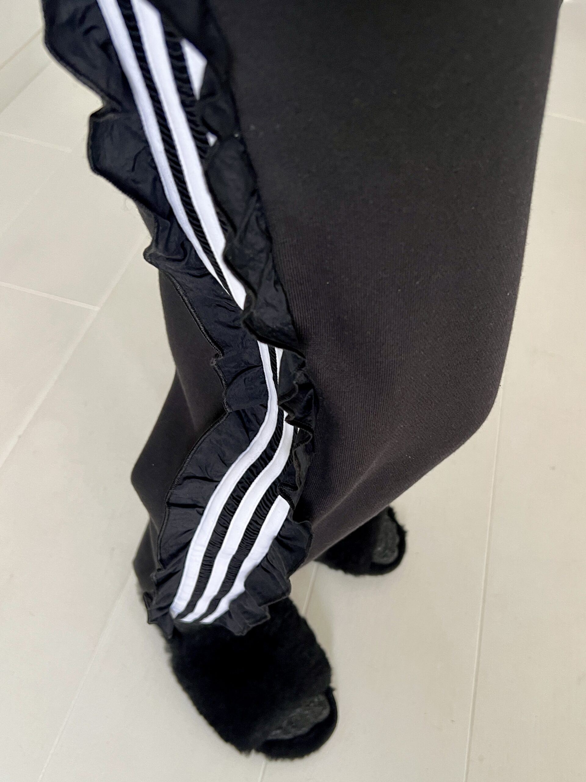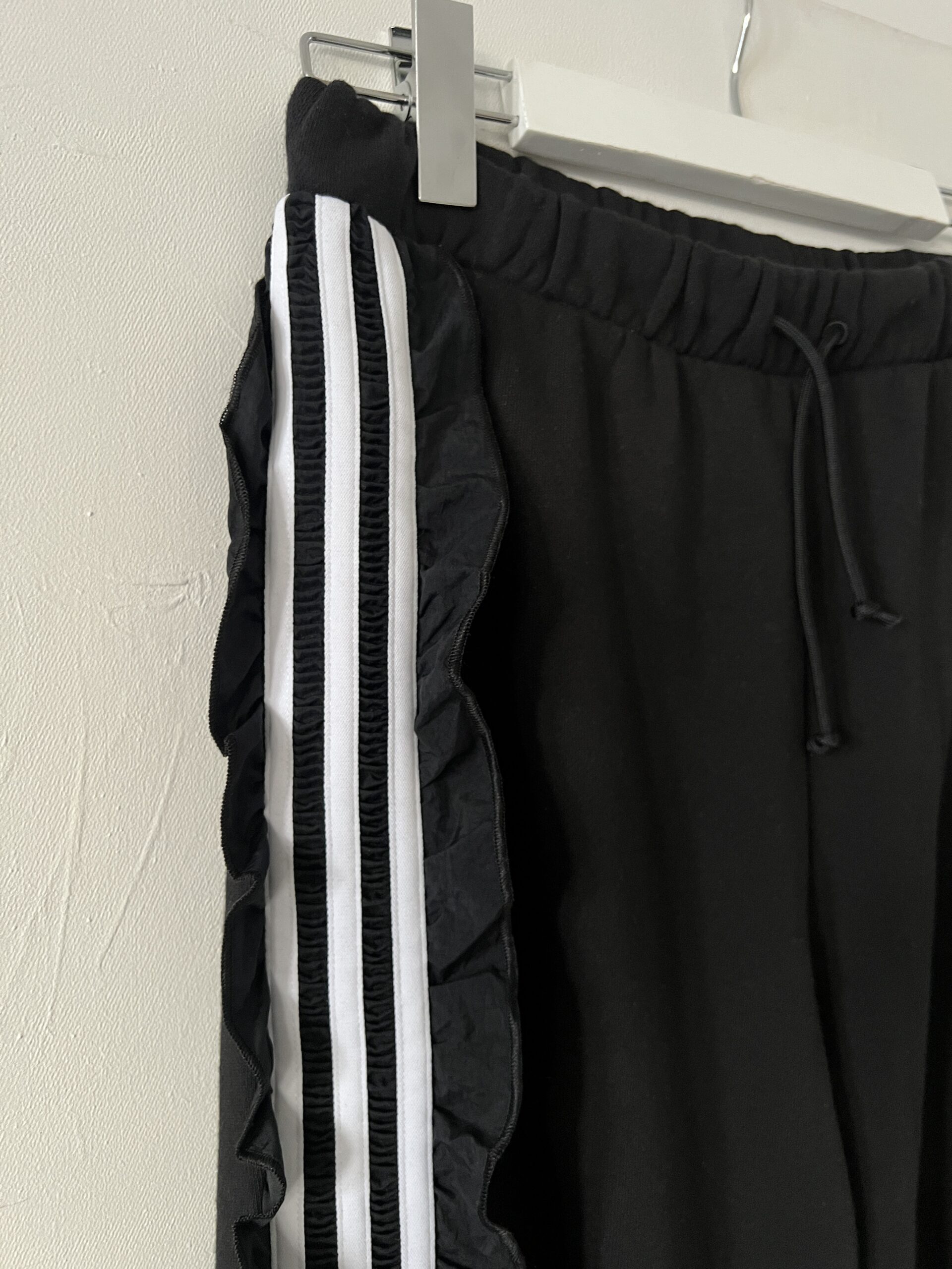 Czarne dresy ADIDAS ORIGINALS model z 3 paskami wykończonymi falbankami, wysoki stan, nogawki zebrane w ściągacz, haftowane logo z tyłu na łydce.