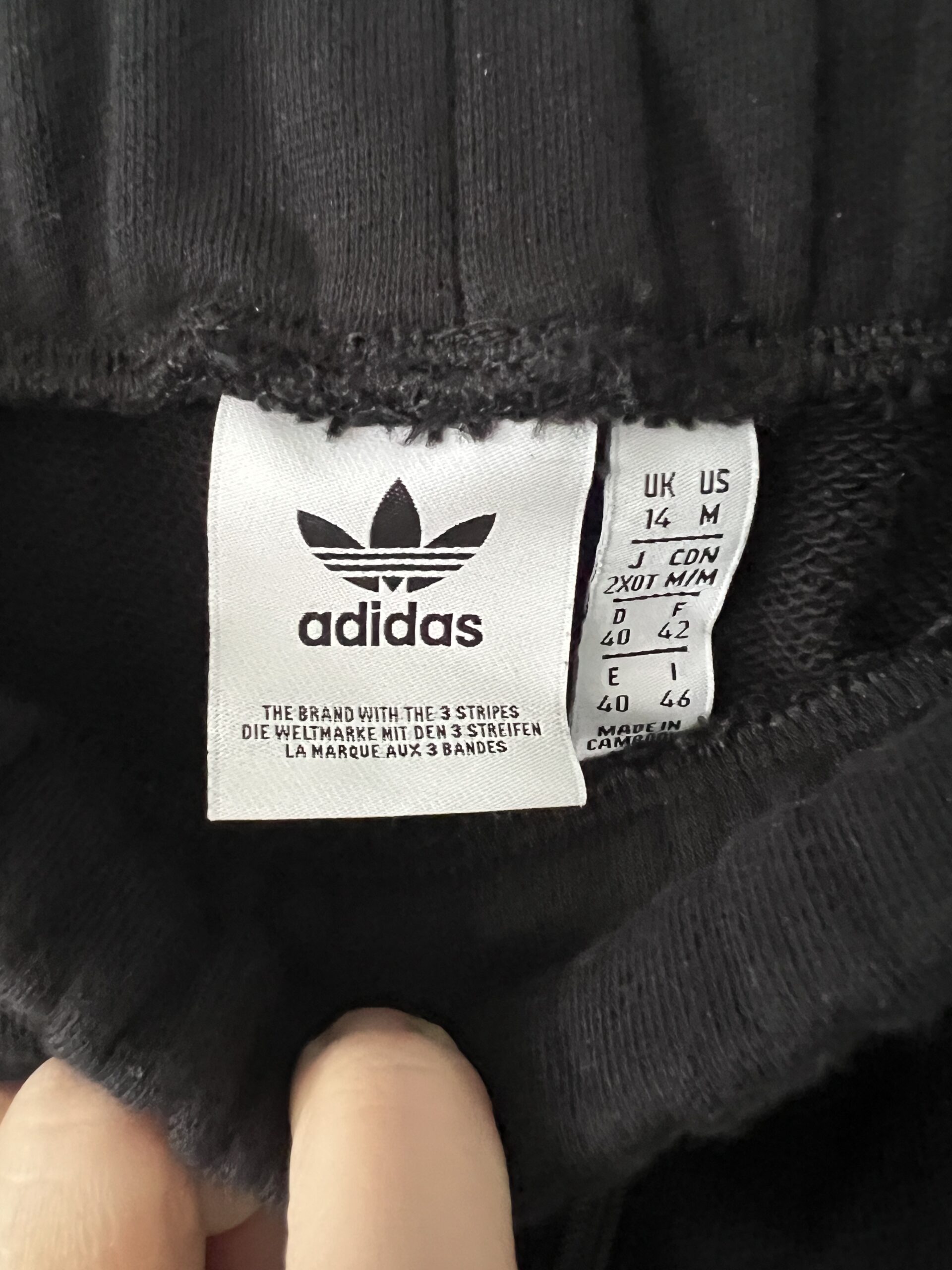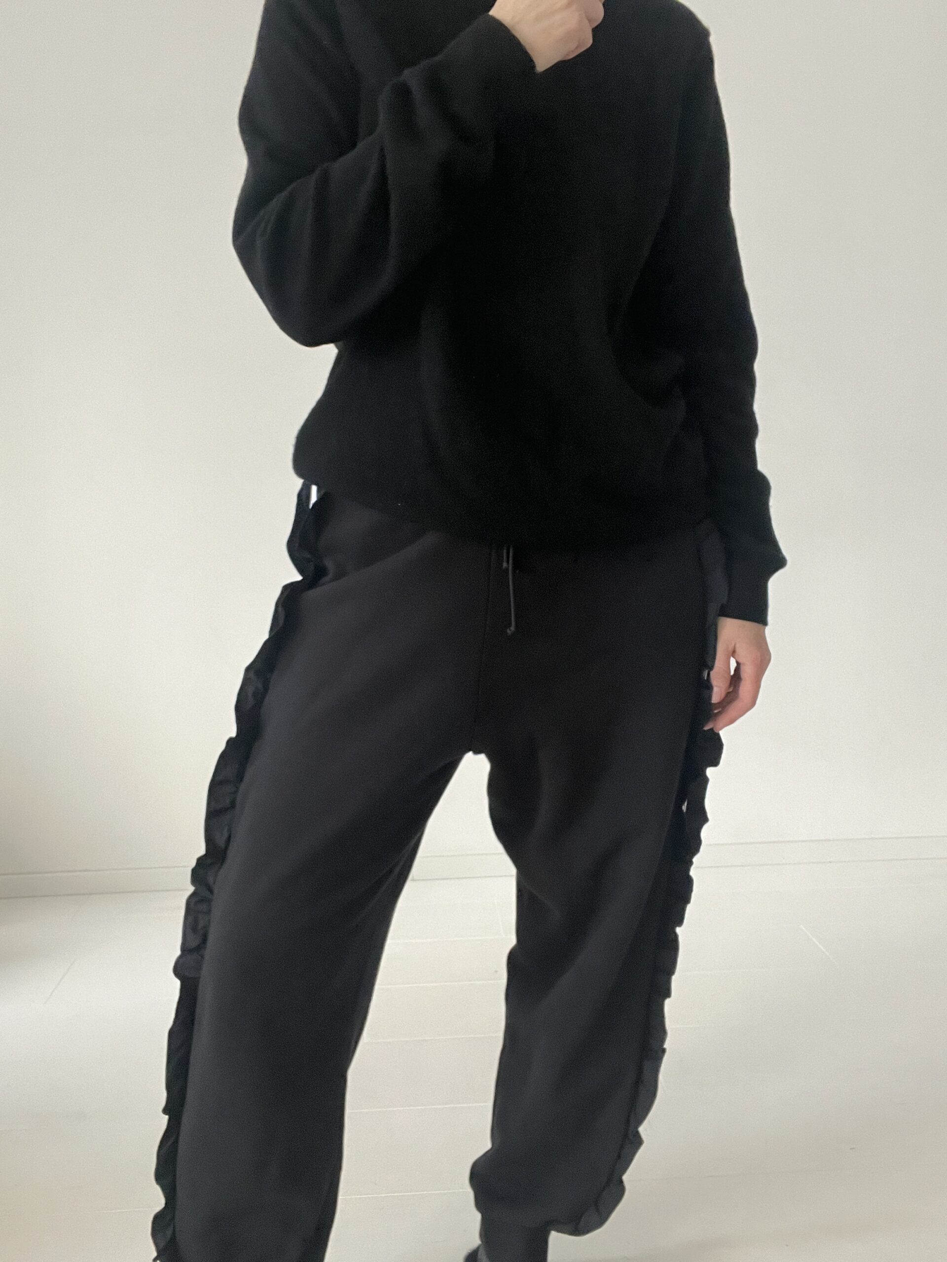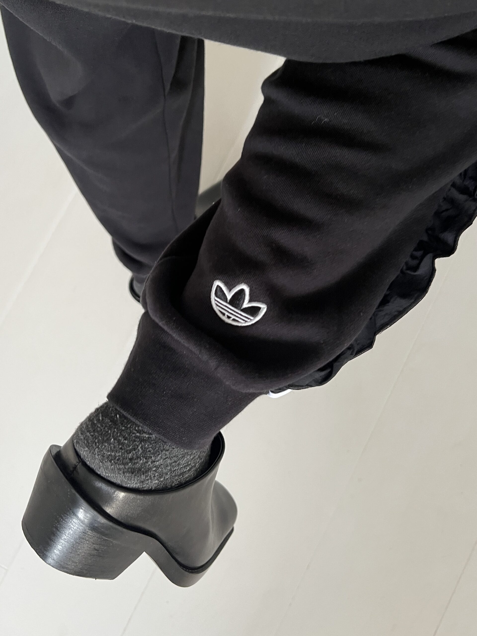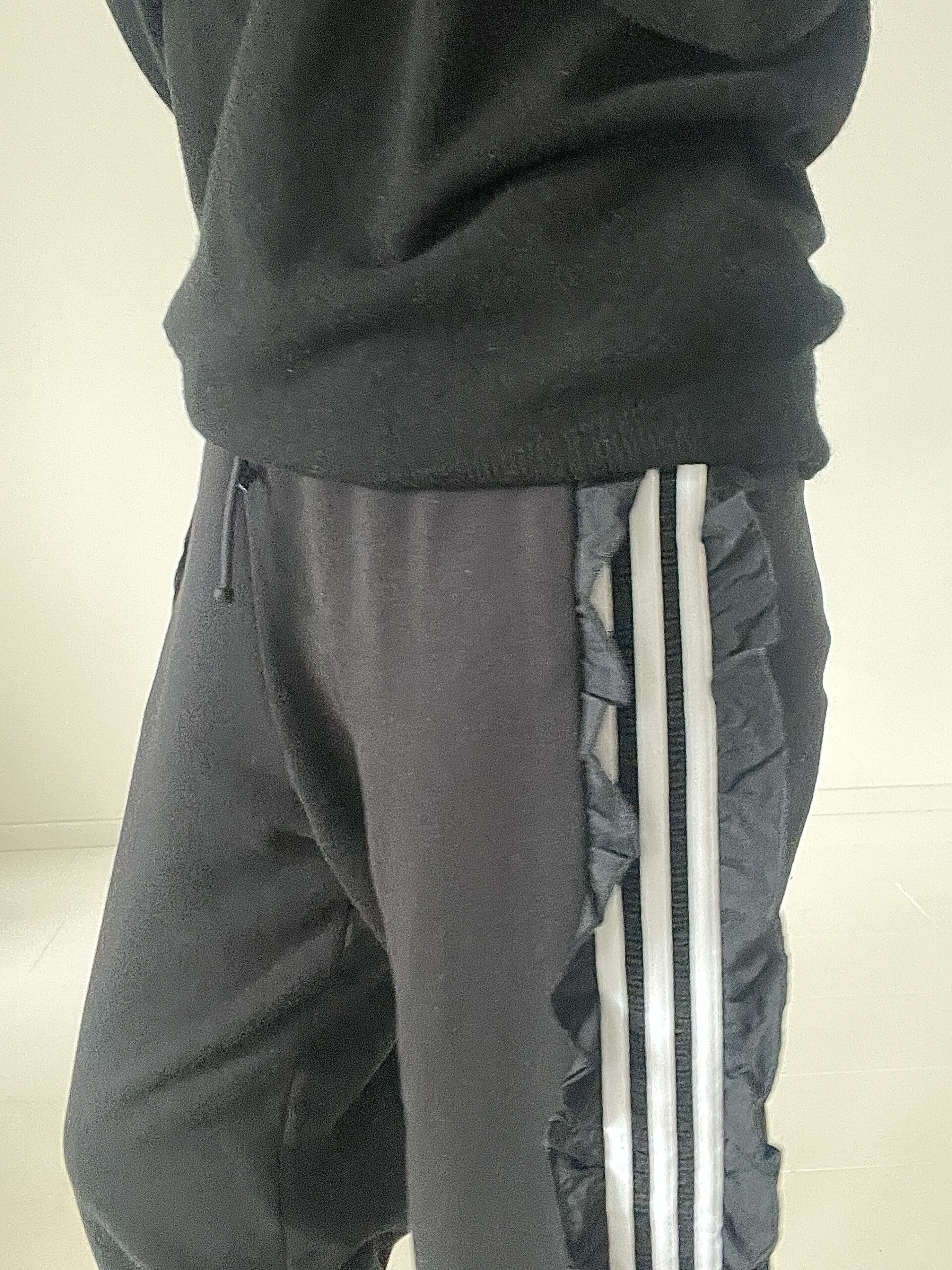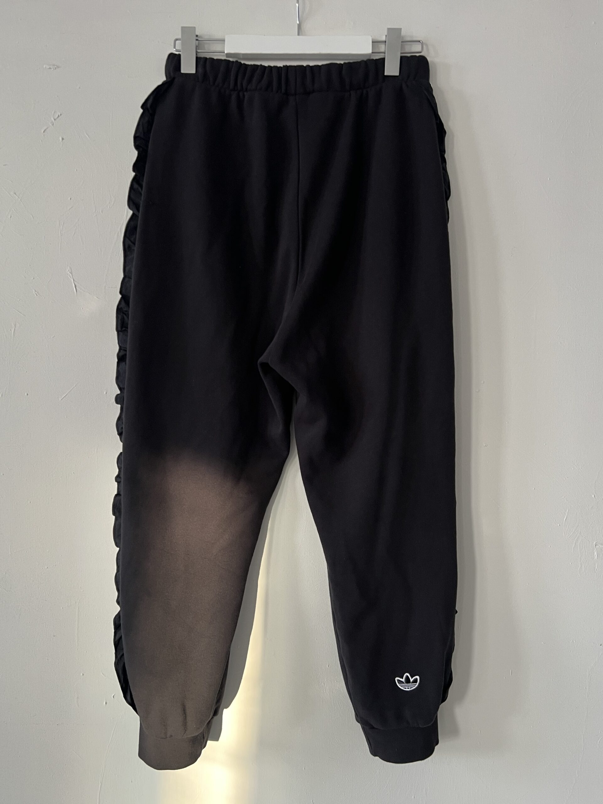 Czarne dresy ADIDAS ORIGINALS model z 3 paskami wykończonymi falbankami, wysoki stan, nogawki zebrane w ściągacz, haftowane logo z tyłu na łydce.