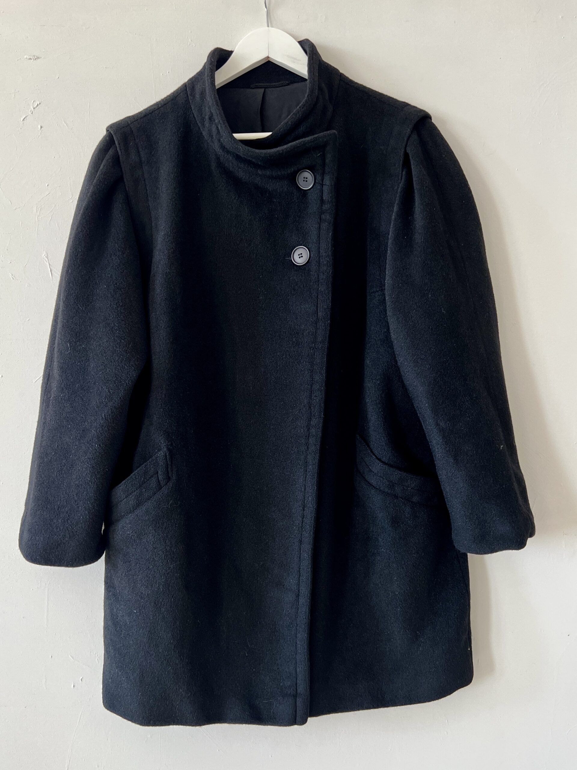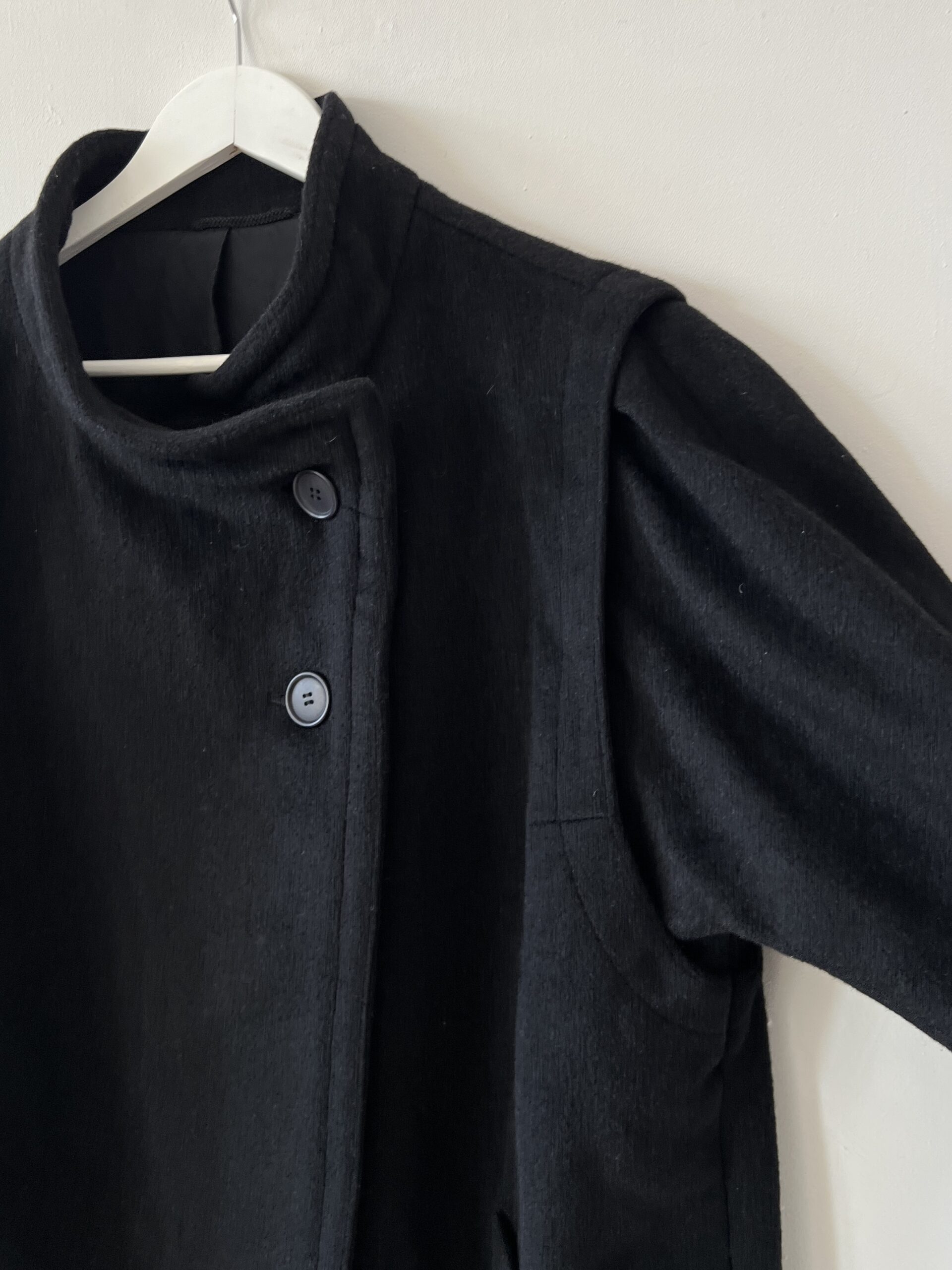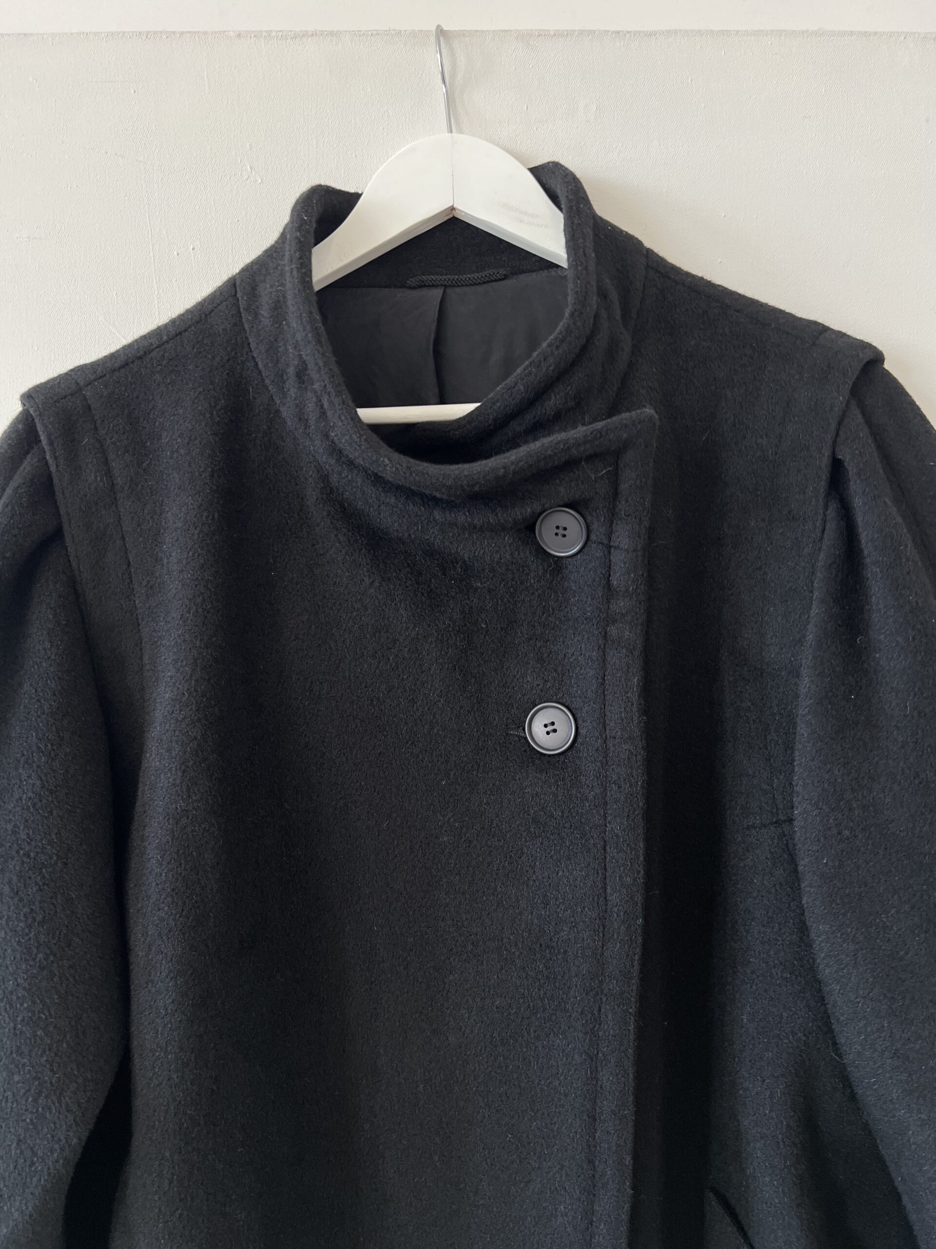 Czarna dłuższa kurtka ze 100% wełny, vintage forma z asymetrycznie zapinaną stójką oraz ciekawie wszytymi, rękawami z bufkami.