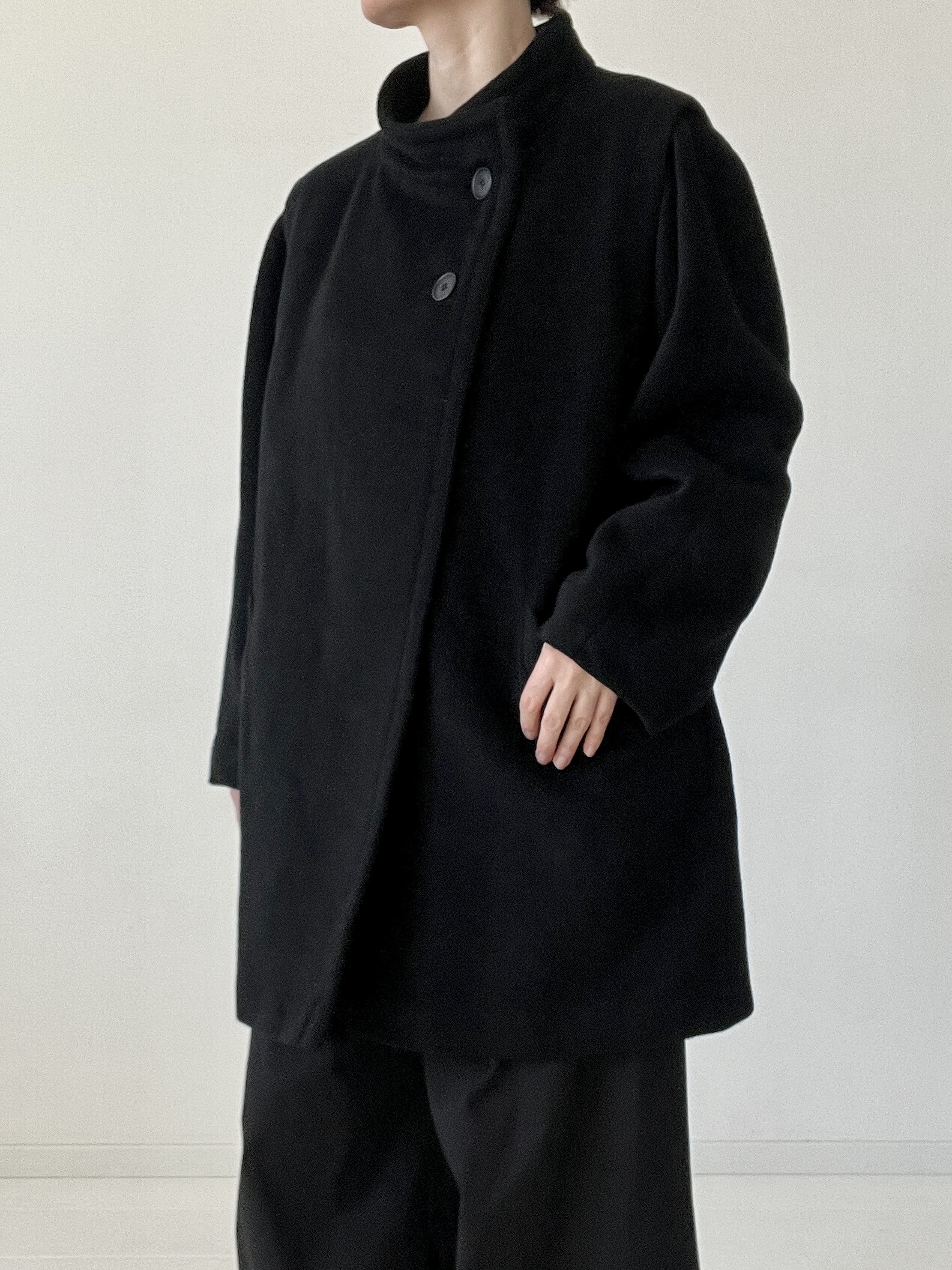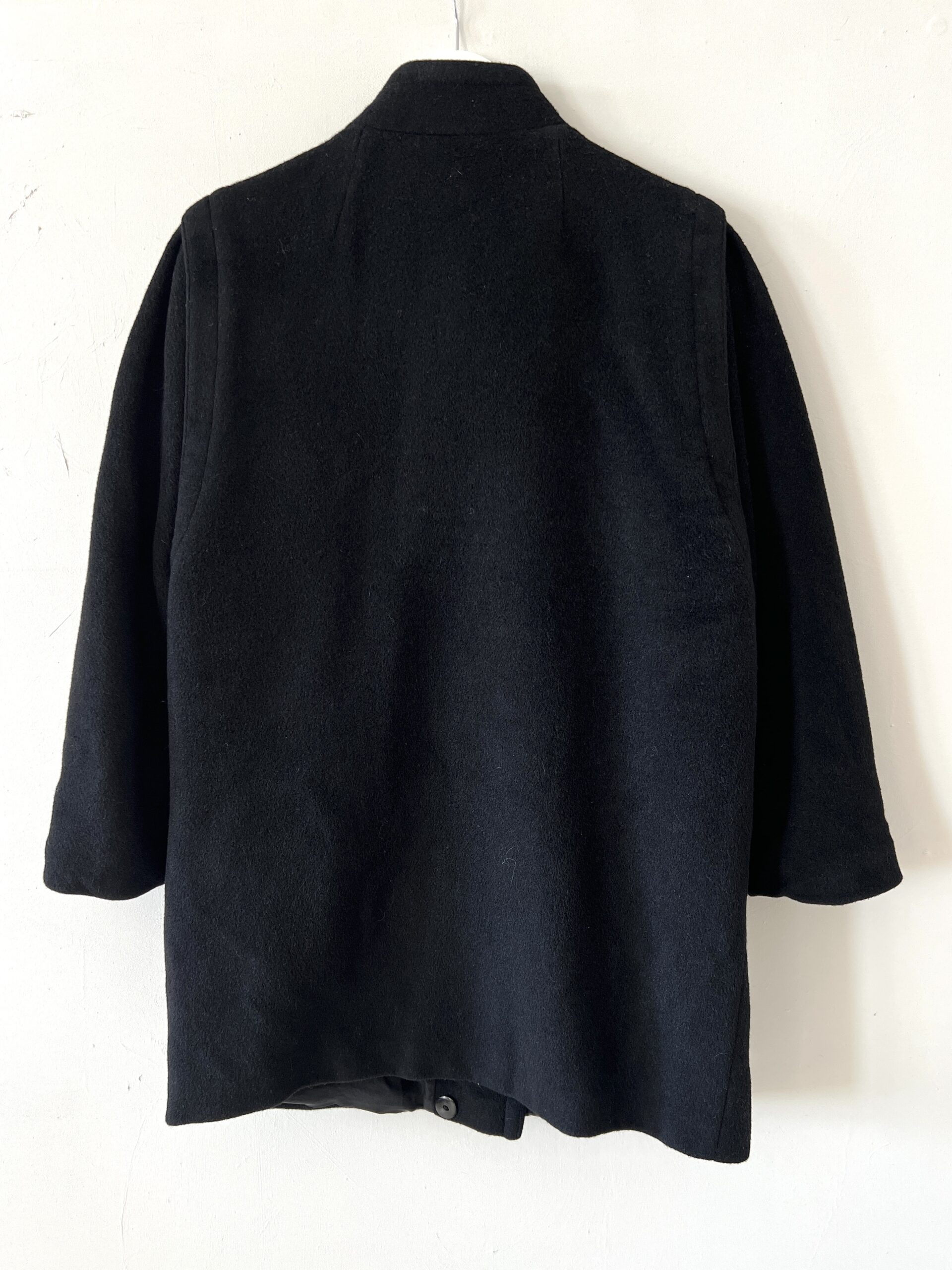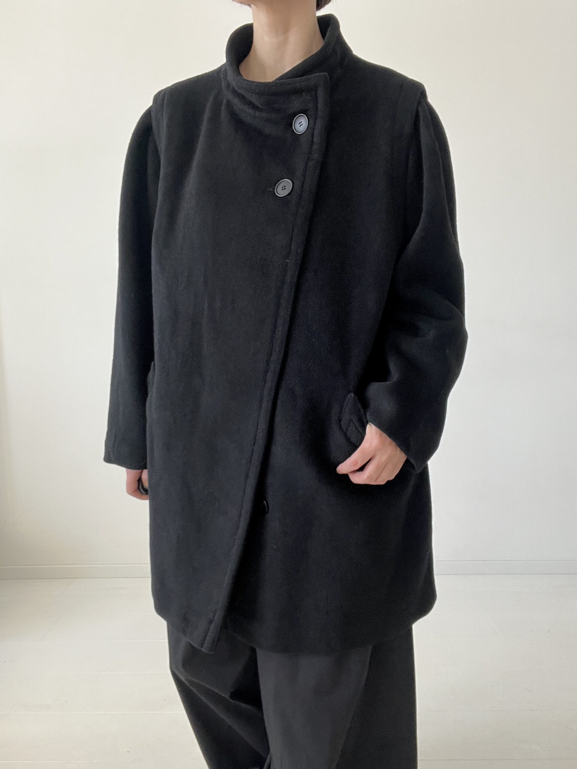 Czarna dłuższa kurtka ze 100% wełny, vintage forma z asymetrycznie zapinaną stójką oraz ciekawie wszytymi, rękawami z bufkami.